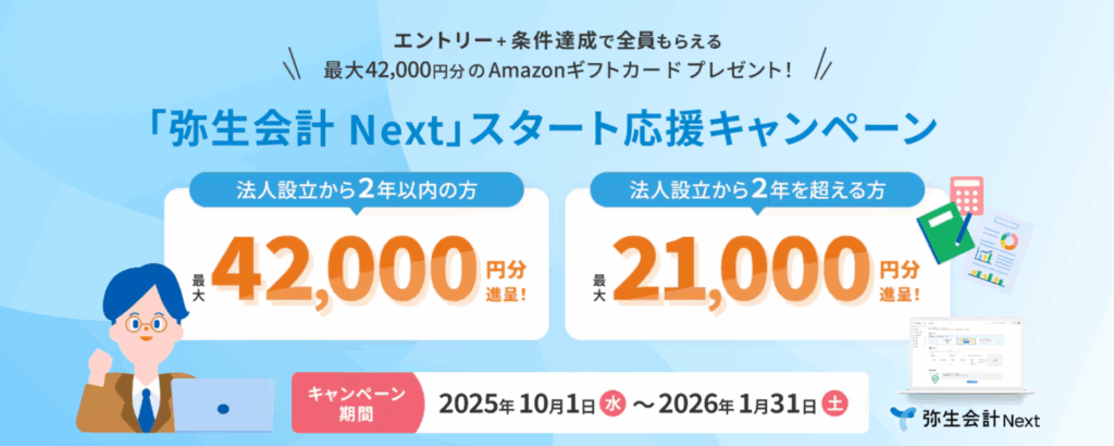 弥生会計Nextの有償プランの年間契約&エントリー&アンケート回答&仕訳登録30件以上で『最大42,000円分のAmazonギフトカード』をプレゼント。2026年1月31日まで