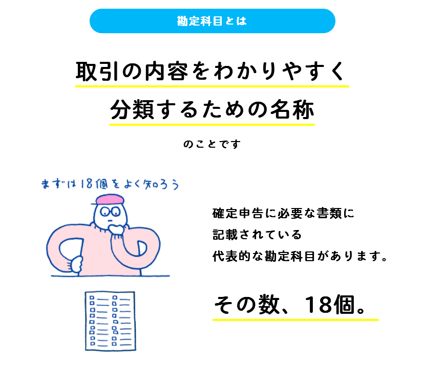 代表的な18種類の勘定科目、ぴったり当てはまる勘定科目がない場合の対処法、などが解説されています。