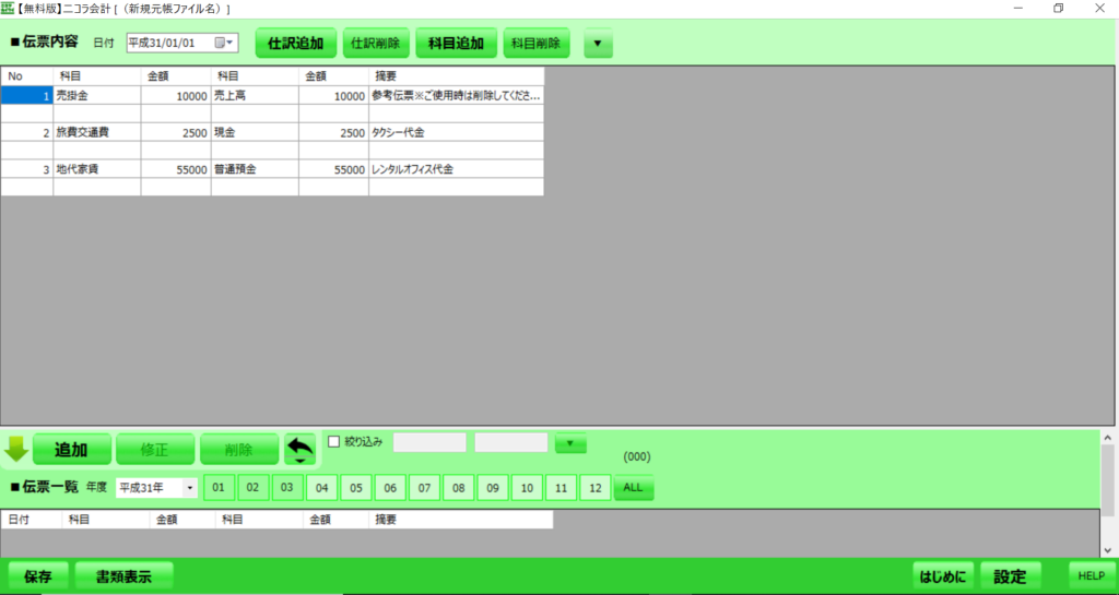 マニュアルによるとよく使う仕訳リストと仕訳履歴を呼び出す機能が画面右側に表示されるとのことですが、私が利用した際は登録した仕訳数が少ないせいなのかメニューが表示されませんでした。