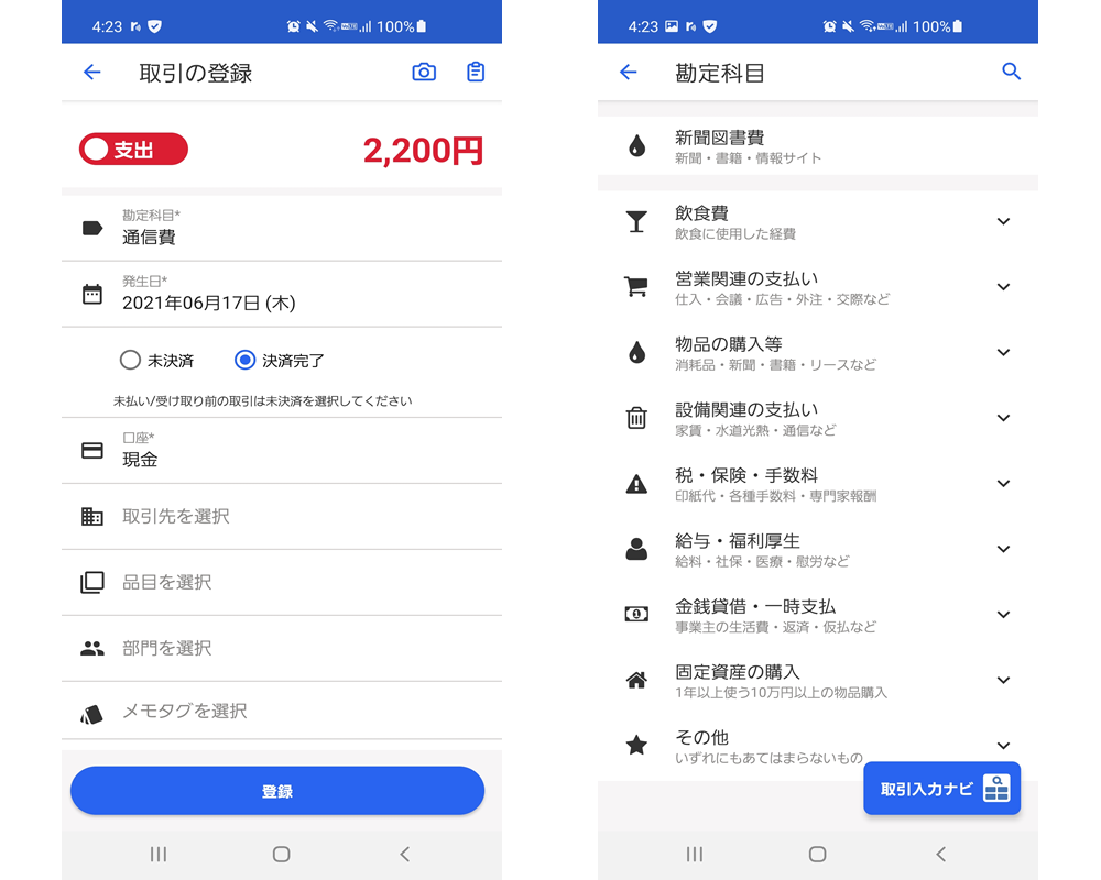 収入か支出かを選んで、勘定科目を候補から選択、金額を入力すれば自動的に仕訳が作成されるので、家計簿感覚で使えます。